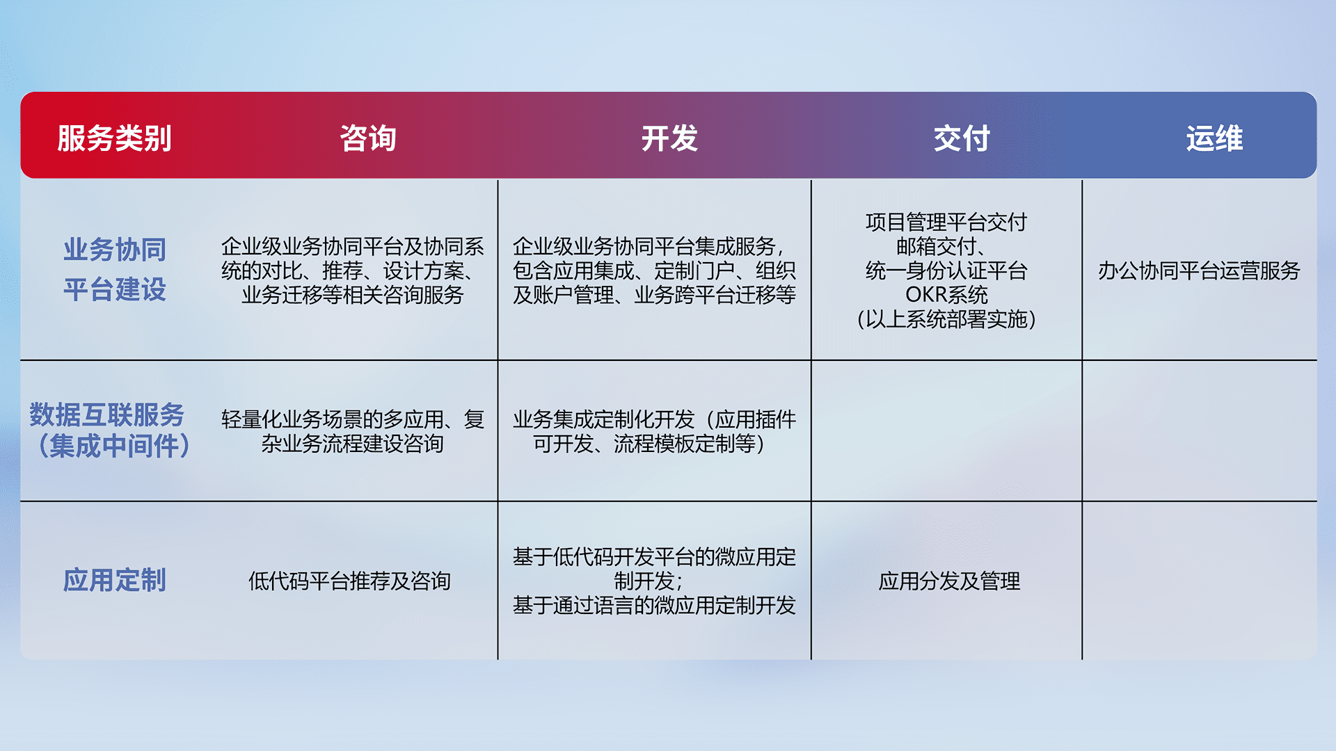 针对钉钉、、、、企微、、、、IDaas等平台级产品提供产品的规划、、方案、、、交付、、、、定制化开发等服务,,,实现如统一协同办公、、智能客户服务、、、混合会议管理、、、智能数据查询、、、、等业务场景,,实现数字化转型。。。。